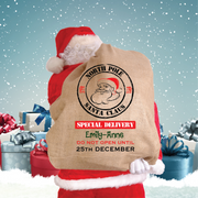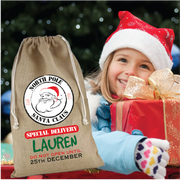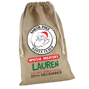 North Pole Santa Claus Special Delivery Santa Sack. Made from jute material and screen printed, these make a perfect for your friends and family. They are available in 3 sizes and can be personalised.