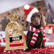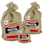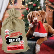 Overnight Delivery, Doggie Santa Sack, if undelivered please return to, The Squeaky Toy Company, The North Pole C/O Santa Paws and the Elves. Made from jute material and screen printed, these make a perfect for your pawsome friends. They are available in 3 sizes and can be personalised.
