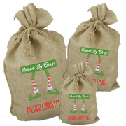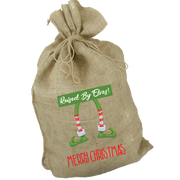Raised by Elves Santa Sack,  Made from jute material and screen printed.  These make a perfect for your friends and family.  They are available in 3 sizes and can be personalised.