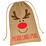 Smiling Reindeer Santa Sack.  Made from jute material and screen printed, these make a perfect for your friends and family.  They are available in 3 sizes and can be personalised.