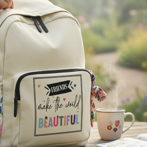 View full detailsFriends make the world beautiful Rucksack A lovely natural colour canvas rucksack with a printed pocket. A good sized bag for carrying your stuff!