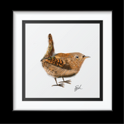 Wild birds are such fun to watch in the garden and I love to watch them, observe and are facinated by the movement of their feathers, I photograph the birds and then paint them.  This was a baby Wren that landed on the top of my bird table and I took her picture.  She was grateful for the meal worms and flew off.  I however, was even more grateful for this photograph which I was then able to paint, and this is the results. Wren Art Print of the original, square double mounted prints presented on soft water colour textured FSC paper.  Frames are not included.  This image has been painting by Autistic Artist SJH Designs.